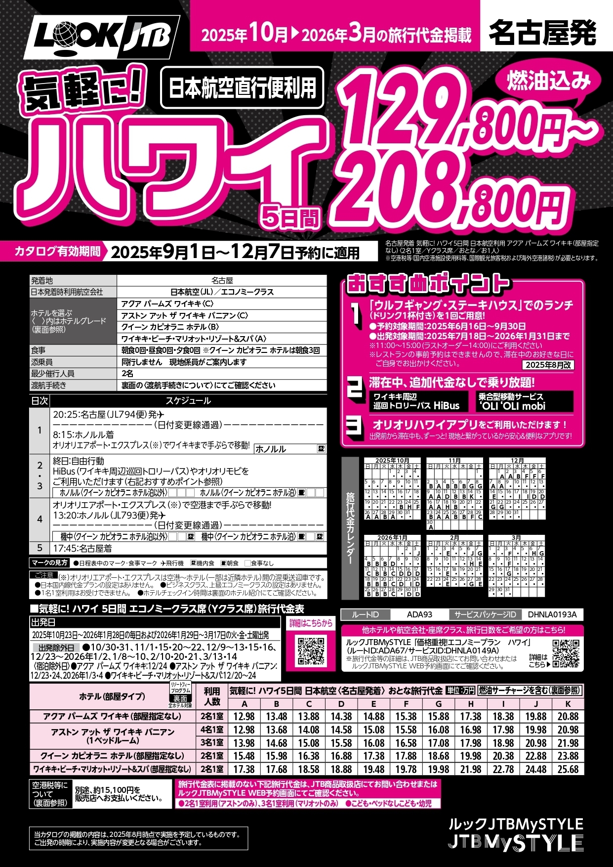 (ハワイ)2025年10月~2026年3月出発 (グアム)2025年10月~2026年2月出発 (台北) 2025年9月~2026年1月出発 (ソウル)2025年9月~2026年1月出発 ※除外日あり